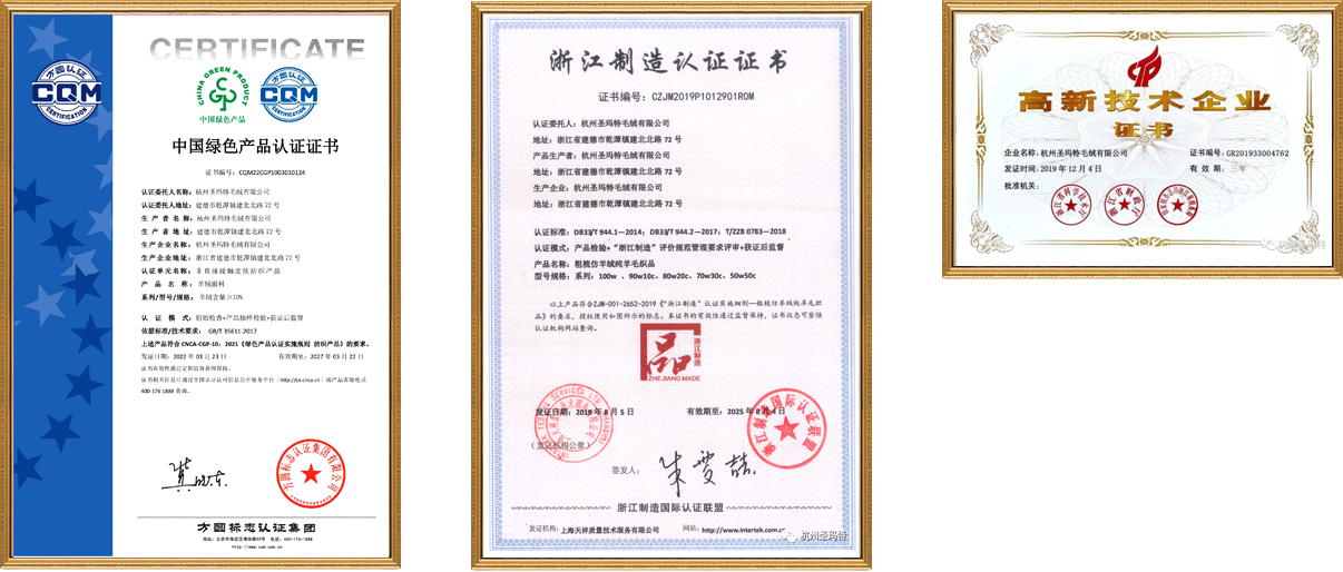 同時(shí)結(jié)合紡織標(biāo)準(zhǔn)化工作公司也做了大量工作。第一,實(shí)際生產(chǎn)過(guò)程嚴(yán)格執(zhí)行毛紡織產(chǎn)品行業(yè)標(biāo)準(zhǔn)和出口產(chǎn)品的歐盟標(biāo)準(zhǔn)、美國(guó)標(biāo)準(zhǔn)和日本標(biāo)準(zhǔn),并擁有出口日本的《白名單》認(rèn)證證書(shū)。第二, 本公司積極響應(yīng)浙江省政府提出的“品字標(biāo)-浙江制造”的號(hào)召,2018年初起草了《粗梳仿羊絨純羊毛制品》的團(tuán)體標(biāo)準(zhǔn),并于年底獲得通過(guò)并執(zhí)行;第三,積極參與浙江省紡織品標(biāo)準(zhǔn)化工作公司獲得浙江省紡織標(biāo)準(zhǔn)化工作--優(yōu)秀單位,公司總經(jīng)理王秋實(shí)獲得浙江紡織標(biāo)準(zhǔn)化工作先進(jìn)個(gè)人,并被聘請(qǐng)為全國(guó)紡織品標(biāo)準(zhǔn)化技術(shù)委員會(huì)羊絨制品分技術(shù)委員會(huì)委員。